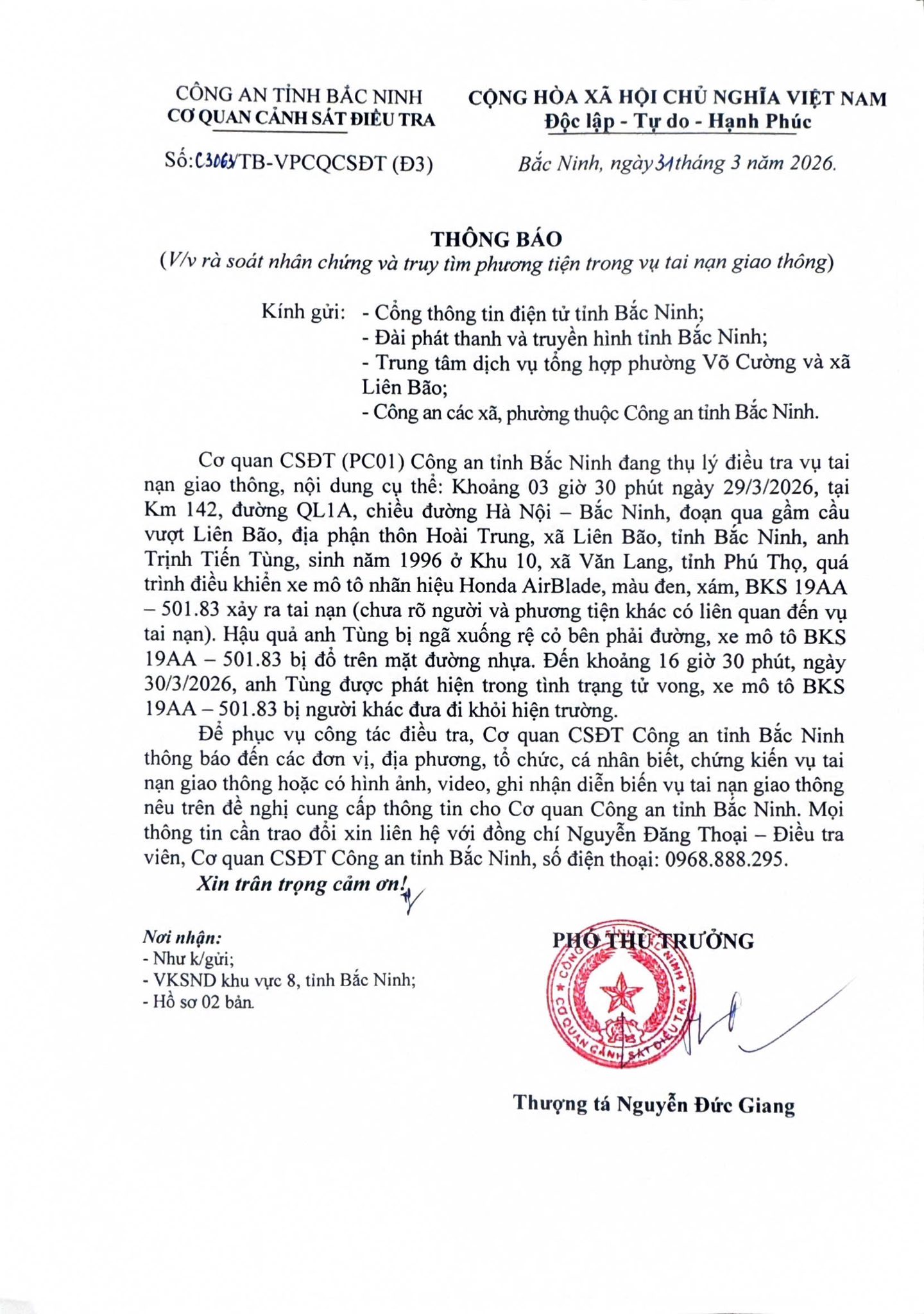 Công an xã Tiên Du kính gửi bà con nhân dân thông báo của Cơ quan Cảnh sát điều tra Công an tỉnh rà soát nhân chứng và truy tìm phương tiện liên quan đến vụ tai nạn giao thông xảy ra vào khoảng 03h30’ ngày 29/3/2026 tại Km142 Quốc lộ 1A, chiều Hà Nội - Bắc Ninh, đoạn qua gầm cầu vượt Liên Bão.