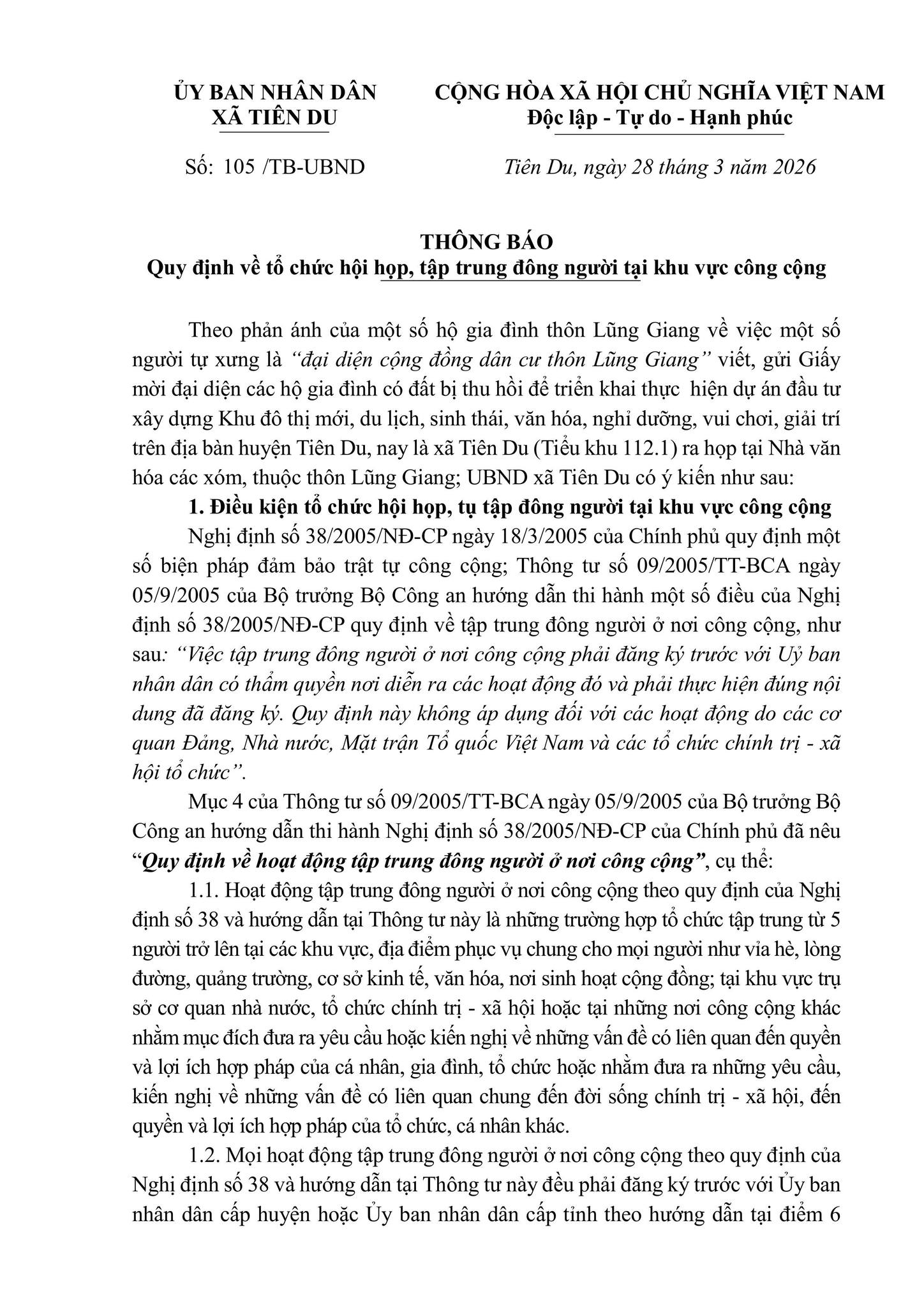 ỦY BAN NHÂN DÂN XÃ TIÊN DU 📢THÔNG BÁO Quy định về tổ chức hội họp, tập trung đông người tại khu vực công cộng